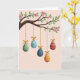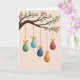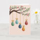 Designed with a springtime feel, this card shows a gently curving tree branch stretched across the top, dotted with fresh green leaves and soft pink blossoms 🌷. Hanging from the branch are five egg-shaped ornaments on thin golden cords, each tied with a small bow, creating a sweet, shared moment as they sway at different lengths like friends gathered close. The background is a smooth, pale pink that keeps the scene calm and lets the decorations stand out without feeling busy. Near the upper area, a short greeting sits in small white lettering, centered and spaced neatly so it doesn’t compete with the artwork. One ornament is sage green with white dots, another is teal with white stripes and wavy lines, and a deep indigo one is sprinkled with tiny white specks. A rich red ornament carries narrow golden bands and zigzags, while a warm yellow one repeats those golden accents, adding a soft glow 🐰. Each egg has a lightly brushed texture, and the cords catch the light with a gentle shine against the pink backdrop.