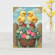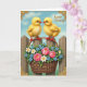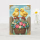 This card features two fluffy yellow fledgling birds perched on the braided handle of a woven basket, leaning close as if sharing a quiet, affectionate moment 🐇. Their tiny dark eyes and small red beaks and feet add crisp accents against the soft yellow feathers, drawing your gaze right to their almost beak-to-beak pose. Below them, the basket brims with spring flowers, including deep pink blooms with golden centers, clusters of white blossoms, and small blue five-petaled flowers tucked among green leaves 🌷. A rustic wooden fence runs across the background, grounding the scene beneath a pale blue sky with light, wispy clouds. An ornate golden border frames the illustration, giving it a classic, keepsake look without feeling fussy. In the upper right corner, the words “Easter Greetings” sit neatly in a small, dark font that stands out against the sky. The woven basket shows tight, interlaced strands, and the handle curves upward in a gentle arc beneath the birds.