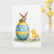 This design shows a spring scene on a bright white background, centered on a large decorated egg that feels like a shared secret between friends 🐰. The egg is divided into sky-blue panels with small white circles, separated by a golden band sprinkled with tiny pastel dots. Sitting on top is a small long-eared bunny with rosy cheeks and a pink nose, holding an orange carrot with leafy greens as if offering it to someone nearby 🐇. To the right stands a tiny yellow chick on orange feet, angled toward the bunny with wide dark eyes that suggest a gentle, affectionate exchange. A short Easter greeting appears near the top in soft pastel lettering, with a smaller line of text placed below in a lighter matching color. The scene is grounded by a few thin green grass blades near the bottom, keeping the characters close as they lean toward each other. The egg’s golden band wraps around the middle with scattered pastel dots, and the blue sections are dotted evenly with white circles.