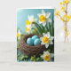 Designed with a soft spring still-life, the front shows a rustic bird’s nest made of thin brown twigs, gently cupping three smooth eggs in a calm robin-egg blue. Around the nest, clusters of white flowers with golden-yellow centers lean in close, like friends gathering shoulder to shoulder 🌷. Some blooms and leaves appear crisp and detailed, while others fade into a gentle blur, giving the scene a quiet, intimate closeness. The background is a pastel blue wash that looks like early morning light, keeping the mood light and airy. Green foliage threads through the arrangement in both sharp and softened patches, adding natural movement without crowding the nest. The greeting text sits near the top in a small, simple font, colored a warm golden yellow that echoes the flower centers 🐇. In the foreground, a few petals curve outward beside the twig weave, with the nearest flower’s yellow center shown in clear detail.