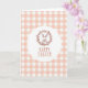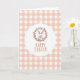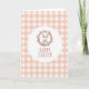 This card features a bright white oval centered on a soft checkered background of muted peach-orange and white squares, like a cozy tablecloth on a spring morning 🌷. Inside the oval, a reddish-brown line drawing shows a long-eared rabbit gently holding a smaller companion, their faces tilted close in a tender, caring pose 🐰. A wreath of budding flowers and curling branches wraps around them, adding a natural frame that feels like twigs and blossoms gathered by hand. The warm earth-tone ink stands out against the white space, keeping the focus on the affectionate pair and their quiet connection. Below the oval, a short Easter greeting appears in simple uppercase letters, centered and printed in the same reddish-brown color. The background stays softly diffused while the central lines remain crisp, giving the scene a calm, intimate look. Small leaf tips and flower buds dot the wreath evenly, with thin branch lines looping toward the lower sides of the oval.