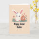 At the center of the card is a cute white bunny with long ears, soft pink inner-ear details, and tiny pink paw pads, wearing a small lavender bow that adds a sweet, friendly touch 🐰. Its wide dark eyes and rosy cheeks give it a tender, affectionate look, as if it’s sitting close for a cozy moment with someone it cares about. The bunny rests on a narrow strip of green grass, with simple coral-and-green flowers on either side that suggest early spring 🌷. To the right sits a decorative oval egg in a deep reddish-orange shade, covered with small white flowers and heart shapes that echo the bunny’s gentle expression. Above them, two small red hearts float in the peachy background, like a quiet sign of closeness between friends or sweethearts. The lighting stays soft and warm, with rounded shapes and pastel tones that keep the scene calm and inviting. Along the bottom, a seasonal greeting is written in thick, hand-drawn lettering in deep charcoal black, centered beneath the illustration. The egg’s white heart motifs stand out crisply against the reddish-orange surface beside the bunny.