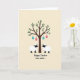 This card features a stylized tree with an earthy brown trunk and thin branches reaching upward, dotted with a few fresh green leaves that hint at early spring. From the branches hang four egg-shaped ornaments in alternating soft pink and light blue, adding a gentle Easter touch 🌷. Beneath the tree stand two fluffy sheep with cloud-like white wool, simple black faces, tiny dark eyes, and slender black legs. They face inward from either side of the trunk, as if sharing a quiet moment together, their calm expressions and balanced stance suggesting an easy friendship. The background stays a smooth creamy beige, keeping the focus on the tree and the pair. A short line of text sits near the bottom in a dark, easy-to-read color, spaced neatly below the scene like a small caption. The eggs are evenly spaced along the branches, with the pink and blue tones alternating above the two sheep 🐰.