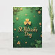 On the front of the card, raised gold lettering in the center reads “St. Patrick’s Day,” catching the light like a small celebration in itself 💚. Just above the title sits a detailed gold shamrock, its leaf sections marked with fine radiating lines like a little crown. The background is a deep emerald green that feels like a quiet field at dusk, setting off the warm shine of the gold. Across the scene, shamrocks are scattered in layers—soft matte green clovers along the edges and glowing gold ones drifting through the middle ☘️. The gold clovers look slightly lifted from the surface, with gentle shadows that make them seem close enough to touch. The arrangement feels like friends gathered in close, with the central message held steady while the clovers circle around it like shared glances and easy laughter. The text stays centered and gold, while the surrounding clovers alternate between muted green and metallic gold against the rich green backdrop. Subtle lighting skims across the raised gold details, leaving soft-edged shadows beneath the shamrock and the scattered clovers.