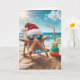 Une étoile de mer portant un chapeau de Père Noël et des lunettes de soleil se détend sur un transat au bord de l'océan avec un cocktail. Le texte est modifiable.