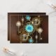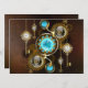 Turquoise lenses with antique watch with brass gears and golden keys on rusty, brown background. Steampunk style.