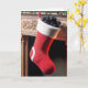 Une grande réserve de Noël rouge remplie de charbon est suspendue dans un mantel de cheminée orné de sculptures. Le texte peut être modifié.