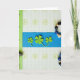 This card shows a tall layout with a cobalt-blue stripe running across the middle, where three green shamrocks sit side by side—two three-leaf clovers leaning in toward a four-leaf clover like close friends sharing a quiet moment 💚. Behind them, a light blue-and-white gingham background is sprinkled with faint lime-green floral outlines that feel like a cozy tabletop scene. Along the left edge, a wide lime-green vertical band resembles a binder spine, dotted with dark round eyelets and a small peek of a clip that adds a tidy, organized touch. On the right edge, a strand of beads drapes downward in glossy black, metallic blue, and textured beige, like an accessory left nearby after a fun evening out ☘️. The overall colors stay cool and fresh, with the greens standing out sharply against the deeper blue center. Any wording would sit neatly over the cobalt stripe in small white letters, centered beneath the shamrocks for easy reading. The beads catch the light in tiny highlights while the shamrocks remain flat and matte against the patterned gingham backdrop.