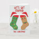 Above the stockings, in bold red letters, it says 'LET'S GET STUFFED,' a funny nod to holiday feasting. At the bottom, it adds 'THIS CHRISTMAS!' to set the seasonal tone. Shadows underneath the stockings add depth. The design is simple but impactful, blending classic holiday themes with a modern twist. It's a charming card that brings a warm, festive feel perfect for spreading holiday cheer. 🎅🏼🎄🎁 Share this card to spread the joy of the season!