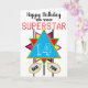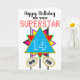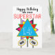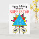 Joyeux 14e anniversaire pour vous. Age 14 est écrit en blanc ouvert face face contre bleu. À l'intérieur de l'âge écrit en rouge texte étalé sur la page. Superstar est écrit en caractères pointillés rouges. Un super héros éclaboussant de couleur en bleu ciel, rouge, vert, violet, rose profond, jaune étoile triangles géométriques. Message spécial à l'intérieur avec bougies colorées d'anniversaire. Personnalisez pour n'importe qui et n'importe quel âge. Amusant à donner à un ami ou à n'importe qui. Oeuvre originale et conception de versets de cartes © TamiraZDesigns.