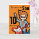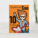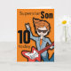 This card says "Superstar Son 10 today. Inside : "Joyeux anniversaire". Or customise with your own words. Fun card featuring a boy with red hair and light skin illustration and design by Sarah Trett. www.sarahtrett.com for www.mylittleeden.com