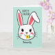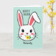 This card features the head of a friendly bunny-like character centered on a pale teal background with a faint grid pattern, outlined by a thin white border 🐰. Two long white ears rise evenly upward, each with a soft pink inner section that adds a gentle, affectionate touch. The face is simple and sweet, with large black eyes and tiny lashes that give it a tender, attentive look, as if it’s gazing at someone special. Light pink blush circles sit on the cheeks, and a small pink nose rests neatly above a tiny mouth. A small yellow flower with a red center and a green stem is held between its lips, like a shy offering to a close friend or partner 🌷. A short greeting appears above the character in a dark, flowing style, while a single affectionate word sits below in matching lettering. The pale teal grid background stays soft and even behind the centered bunny face and the thin white frame.