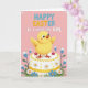 This greeting card features a bright yellow, fluffy little bird perched on a frosted cake, its wide eyes and rosy cheeks giving it a sweet, friendly look that feels like a gentle hello between close friends 🐰. The bird stands with wings slightly out, tiny orange beak open as if chirping, adding a light, affectionate energy to the scene. The cake is iced in white with a sunny yellow ribbon around the middle and a scalloped trim along the edge. Small white daisy shapes and scattered yellow dots decorate the sides, while two red, dotted candy-like treats sit on the top tier for contrast. Around the cake, clusters of blue and white flowers rise from leafy green stems, like a little garden gathered close as if for a shared celebration 🌷. The background is soft pink with a dashed white border and curled corner accents that frame the illustration. Near the top, a festive message appears in rounded lettering, mixing blue and yellow text so it stands out against the pink backdrop. Blue blossoms and green leaves sit near the lower edges, surrounding the cake like a floral border.