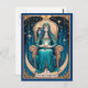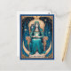 Carte postale dans "La Haute Prêtesse", un archétype tarot, assis sur un trône orné, tenant un cristal brillant. Elle porte une coiffure complexe ornée d'accents dorés. Une chouette, symbolisant la sagesse, se perche à côté d'elle.