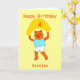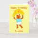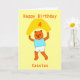 Carte pour tout jeune enfant. Un ours en peluche orange tenant une bannière jaune avec l'âge des enfants, personnalisable. Ajoutez un nom à l'avant de la carte, tout message supplémentaire et les noms à l'intérieur.Montré ici avec le nom Cassius et âge quatre. Changez facilement l'âge et le nom.