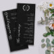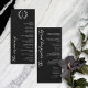 Élégant programme de mariage noir 9x4 dans un design de typographie noir et blanc avec un monogramme de couronne de laurier et de belles polices. Programme de mariage de typographie noire avec un monogramme de verdure et de belles polices. Programme de mariage plat avec un monogramme élégant et de belles polices et détails de verdure en blanc contre un arrière - plan noir.