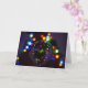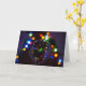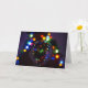 Une main tient une boule de cristal devant une vitrine vibrante et multicolore de lumières de vacances hors du centre. La sphère capture et reflète une belle vue très nette d'un sapin de Noël décoré. Cette carte de voeux de Noël présente une photo de couverture et une oeuvre dessinée à la main par le photographe en chef peut créer de Dieu béni la Keg Publishing LLC, M. Paul John Hausleben.