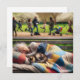 Une femme sans abri déplacée sieste sur le banc du parc pendant que le monde continue autour d'elle. Famille jouant dans le parc, elle est probablement mère et grand-mère aussi.
