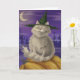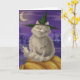 Design graphique d'un chat moelleux portant un casquette pointu aux sorcières et montrant des crocs de vampire.
