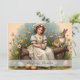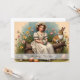 A young girl in an elegant vintage dress sits on a wooden log, holding a beautifully decorated Easter egg. Surrounded by blooming flowers and a curious rabbit, the scene exudes warmth, nostalgia, and the spirit of Easter.