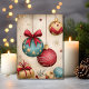 Share timeless holiday elegance with this beautiful Christmas card featuring vintage-inspired ornaments in rich teal, red, and gold hanging gracefully against a warm cream background adorned with delicate snowflakes and starburst accents. The stunning teal ornament with golden stars and luxurious red bow, paired with wrapped presents below, creates a sophisticated, classic aesthetic perfect for those who appreciate refined holiday style. Ideal for sending elegant wishes to family, friends, or colleagues. Fully customizable inside message.