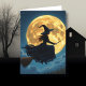 Une sorcière super cool devant une carte d'Halloween pleine lune avec une page de coloriage intérieur.