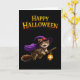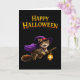 Send some perfectly magical wishes this season with our magical witch kitten soaring greeting card this adorable design features a cheerful tabby kitten dressed in a purple witches hat and Cape flying through the night on a broomstick with a glowing lantern set against a clean deep black background with bold vintage style Halloween lettering this card captures the sweet and whimsical side of the holiday. It's the ideal choice for cat lovers's children or anyone who enjoys a touch of charm with their spooky celebrations high quality and ready for your personal message. This card is a heartwarming way to say happy Halloween