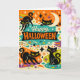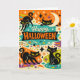 A vibrant, high-energy Halloween illustration inspired by classic mid-century modern and atomic-age design. Playful black cats with glowing chartreuse eyes leap, lounge, and pose around a bold “Happy Halloween” banner, surrounded by starbursts, crescent moons, orbit motifs, and abstract shapes. The saturated palette of pumpkin orange, teal, chartreuse, cream, and black gives the artwork a joyful retro punch, blending spooky charm with whimsical optimism.