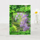 Photo de mur de pierre recouvert de lierre avec fenêtre à travers laquelle on voit" couler" glycine couleur lavande. La carte est vide à l'intérieur.