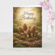 A warm and whimsical birthday design featuring a small cluster of realistic morel mushrooms rising from a mossy forest floor. Soft golden sunlight filters through the trees in the background, creating a peaceful woodland glow that pairs beautifully with the elegant “Happy Birthday” script above. Earthy textures and natural details make this card perfect for nature lovers, foragers, and those who appreciate rustic, organic beauty.