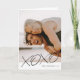 Cette carte de voeux minimaliste de la Saint-Valentin comporte une grande photo du client, ainsi que l'expression "XOXO" en caractères gras et écrits à la main. Une simple bande de couleur permet au nom du client de rester lisible. L'arrière de la carte comporte un motif de coordination et typographique.