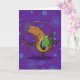 A funny capybara dancer on a greeting card. A version with no text, featuring an illustration of a blissful capybara rhythmic gymnast with a hoop, dancing in front of a bright blue and magenta floral pattern on a darker purple background.