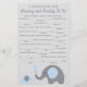 Utilisez nos cartes de conseils de baby shower sur le thème de l'éléphant bleu et gris pour laisser leurs conseils et vœux de manière amusante et unique. La carte comporte des phrases comme "Assurez-vous de toujours avoir ___________ dans le sac à couches" et de "_____________ le bébé chaque jour".