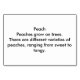 Ces cartes à mémoire présentent une peinture d'une pêche mûre, jaune et rouge à la feuille verte. L'un des côtés inverse est le texte qui dit, "Pêche Peaches poussent sur les arbres. Il existe différentes variétés de pêches, allant du sucré à l'acidulé." Le texte est facile à customiser sur le formulaire modèle. Merci pour l'achat CustomFlashCards sur Zazzle pour la lecture de cartes mémoires pour adultes. J'étais un tuteur en alphabétisation pour adultes, et ces types de cartes flash auraient été très utiles.