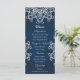 Une belle saphir marine bleu foncé JEWEL TONED et argent look carte de menu mariage avec un sari d'inspiration indienne exotique MEDALLION motif AVEC UN DESIGN FLORAL ET LOTUS SUNBURST. Cette belle et élégante invitation de mariage à l'indienne moderne est parfaite pour toute occasion formelle AVEC UN THÈME DE NUITS D'ARABIE OU D'ALADDIN INDONÉSIEN ORIENTAL. Conçu par Chrissy H. Studios, LLC. Tous droits réservés.