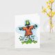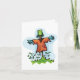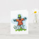 Ne lui soyez pas effrayé est juste un épouvantail. Ils sont conçus pour effrayer les oiseaux loin. Cet épouvantail a un dessus orange dessus et semble utiliser un seau sur sa tête. C'est des bras sont tendus et IS-IS se tenant dans une certaine herbe verte. Cette conception d'épouvantail semble grande sur ces cartes de note