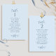 Aidez vos invités à trouver leur table avec ces élégantes cartes de plan de sièges avec le nom des invités. Cartes recto verso pour que les clients puissent chercher leur nom à l'avant et à l'arrière. Libérez de l'espace tout autour en vous donnant la liberté d'utiliser des clips ou des trous de poinçonnage pour accrocher des écrans, ou d'utiliser un support/cadre de table. Design en arrière - plan bleu poussiéreux, texte bleu, délicat détail floral dessiné à la main dans les tons bleus, et détails calligraphie manuscrits. Plusieurs options de couleur. Ayez tous les numéros de table dans la même couleur ou mélangez les couleurs selon le thème de couleur de votre événement. Une partie d'une collection avec une variété de produits de coordination disponibles, y compris les cartes de numéro de table et les menus.