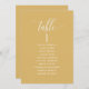 Aidez vos invités à trouver leur table avec cette élégante carte moderne de plan de salon avec les noms des invités. Cartes recto-verso pour que les clients puissent chercher leur nom à l'avant ou à l'arrière. Libérez de l'espace tout autour en vous donnant la liberté d'utiliser des clips ou un trou de perforation pour accrocher des écrans, ou d'utiliser le support/cadre de table. Arrière - plan jaune moutarde et texte blanc. Détails de calligraphie manuscrite moderne. Plusieurs options de couleur. Ayez tous les numéros de table dans la même couleur ou mélangez les couleurs selon le thème de couleur de votre événement.