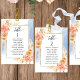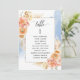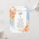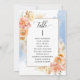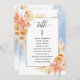 Aidez vos invités à trouver leur table avec cette élégante carte moderne de plan de salon avec les noms des invités avec la pêche exquise et crème fleurie et couleur d'eau bleue. Cartes recto verso pour que les clients puissent regarder les deux, avant ou arrière pour voir leurs noms dans des affichages suspendus. Libérez de l'espace tout autour en vous donnant la liberté d'utiliser des clips ou un trou de perforation pour accrocher des écrans, ou d'utiliser le support/cadre de table. Cadre aux délicats détails floraux dans un beau mélange de pêche, d'orange, de rose vif, de corail poussiéreux et de champagne crème. Détails de calligraphie manuscrite moderne. Plusieurs options de couleur. Ayez tous les numéros de table dans la même couleur ou mélangez les couleurs selon le thème de couleur de votre événement. Une partie de notre collection "Peach Floral Delight with Blue" avec une variété de produits de coordination disponibles, y compris des cartes de numéro de table et des menus. Visitez la collection entière à l'adresse suivante : https://www.zazzle.com/collections/peach_floral_delight_with_blue-119436951689312574