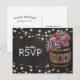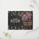 Cartes de réponse de mariage champêtre élégant avec un fond de tableau noir craie rustique, guirlande lumineuse, roses roses et fleurs de gypsophile, un tonneau de vin en bois avec vos initiales et un morceau de ficelle nouée.