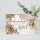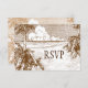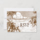 Une plage tropicale modifiable gravant RSVP carte modèle avec des lettres de script et de serif sur une gravure vintage de palmiers bruns sur une plage de sable et de beaux nuages sur des vagues océaniques calmes, et espace pour votre réponse et des dates au contraire.