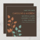 Faites savoir à vos amis et à vos proches que vous vous mariez avec ces annonces de sauvegarde de date modernes et élégantes qui présentent des branches et des feuilles d'arbre de couleur orange et sarcelle sur un fond brun chocolat. Design ultra-moderne avec des lignes et des polices nettes et épurées.
