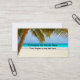 Modèle de carte de visite avec un thème de plage incluant un beau paysage marin montrant un palmier, océan tropical et sable de plage avec votre nom d'entreprise et slogan sur le devant. Customisez le revers qui affiche les informations de votre entreprise et les coordonnées de votre contact. Conçu pour un agent immobilier, un thème de retraite ou un voyage.
