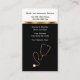 cartes de visite d'assurance médicale multiligne dotés d'un puissant design à deux côtés noir et blanc qui comprend une ligne de séparation couleur or imprimée sur le devant, un symbole de stéthoscope médical et une disposition de texte que vous pouvez customiser et personnaliser, le tout présenté sur un format vertical carte de visite. Meilleurs cartes de visite pour un agent d'assurance médicale, une agence et leurs représentants commerciaux.