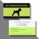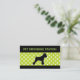 Cartes de visite de marionnettistes avec un beau motif pois vert et blanc stylisé sur un arrière - plan noir, avec l'image d'un chien sur le devant et deux parties du texte vous pouvez customiser et personnaliser qui comprend un modèle de rendez-vous. Remettez vos cartes de visite avec style, ce modèle est conçu pour un toiletteur, un toilettage mobile ou une boutique pour animaux de compagnie.