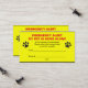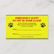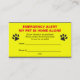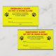 Ces cartes de visite personnalisables sont imprimés avec l'alerte de secours des textes : Mon animal familier est seul à la maison. La carte fournit un endroit pour ajouter des noms du contact et des numéros de téléphone de personnes qui s'inquiéteront de vos animaux familiers si vous êtes blessés ou frappés d'incapacité. La carte est parfaite pour alerter le personnel de secours pour satisfaire à vos souhaits. CES CARTES SONT GRANDES POUR DISTRIBUER AUX ÉVÉNEMENTS D'ADOPTION, AUX MAGASINS D'ANIMAL FAMILIER, OU À D'AUTRES EXPOS D'ANIMAL FAMILIER !