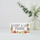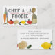Fruits, légumes, huile d'olive, couteau du chef et cartes de visite en bois de cuillère pour des cours de cuisine, chef personnel, traiteur ou restauration, ou d'autres affaires de Plats gastronomiques ou culinaires. Carotte, tomate, oignon, cosses de pois, citron, pomme dans le style d'aquarelle avec des caractères gras.