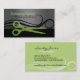 Ce carte de visite unique a un motif vert de ciseaux avec une illustration tourbillonnante de cheveux sur l'avant et le dos de la carte. Personnalisez cette carte avec vos détails. Vos affaires de salon de coiffure se tiendront avec cette conception d'amusement.