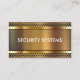 Carte de visite de sécurité au design moderne qui comprend des éléments arrière - plans en métal doré simulés imprimés sur l'avant et du texte que vous pouvez personnaliser sur deux côtés dans ce modèle de design intelligent que vous pouvez customiser. Conçu pour les systèmes de surveillance, la surveillance des systèmes d'alarme, ou les caméras vidéo de sécurité et l'équipement.