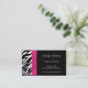 Le zèbre moderne et élégant barre les rayures noires et blanches de zèbre de caractéristiques de cartes de visite sur l'avant et le dos et une frontière rose d'accent sur l'avant. Tenez-vous avec ces cartes de visite uniques. Perfectionnez pour la variété de types et de professions d'affaires. Disponible en une série de couleurs et stock de carte. Personnaliser avec votre information personnelle ou d'affaires. Cliquez sur la "personnaliser il !" boutonnez pour changer le style de police, la taille des textes, la couleur des textes et les plus !